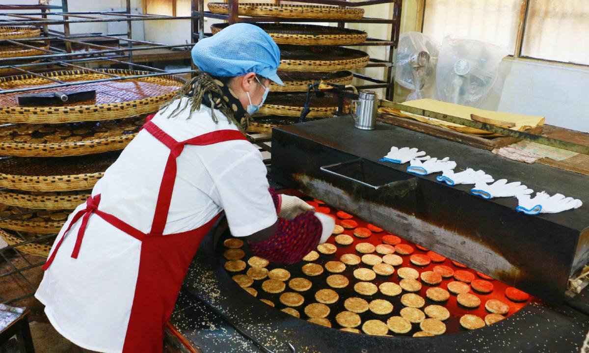 和面、包餡、打餅、搖麻、烘烤……晨光熹微,老下陸街58號益朵港餅廠內(nèi),30多名工人在緊張忙碌著。