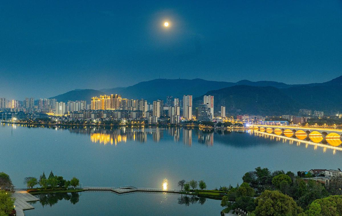 1日,一輪皓月當(dāng)空,清輝灑滿磁湖。黃石融媒記者周巍攝。