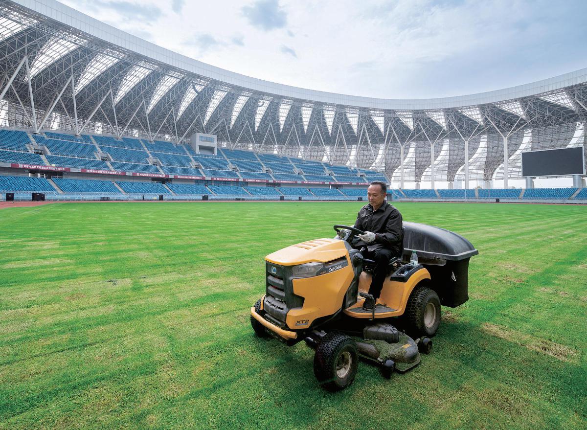 2日,黃石奧體中心體育場(chǎng)內(nèi),工作人員操作專業(yè)設(shè)備對(duì)修剪后的草坪進(jìn)行清理養(yǎng)護(hù)。