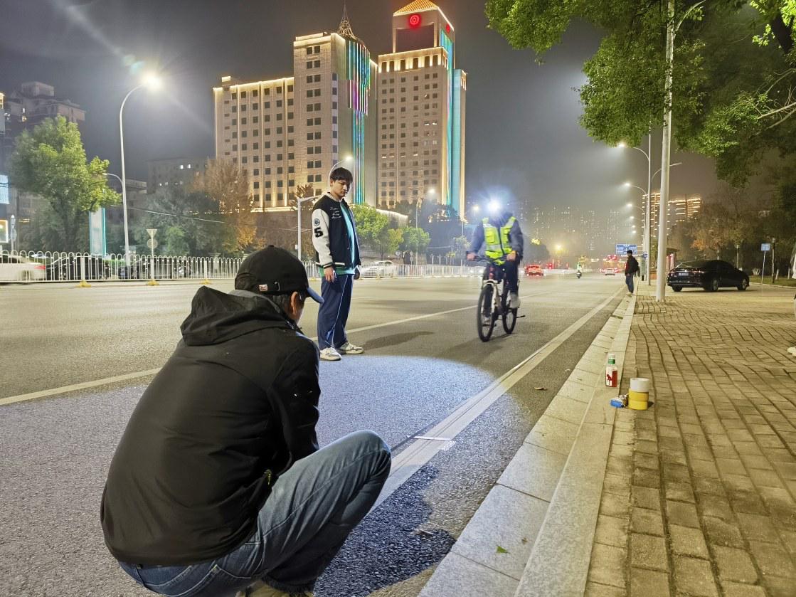 夜色下,這群“賽道先行者”的身影先后出現(xiàn)在了杭州東路、澄月路、頤陽路、武漢路等城市道路上。在經(jīng)過3個多小時的努力后,“黃馬”賽道丈量工作圓滿完成。