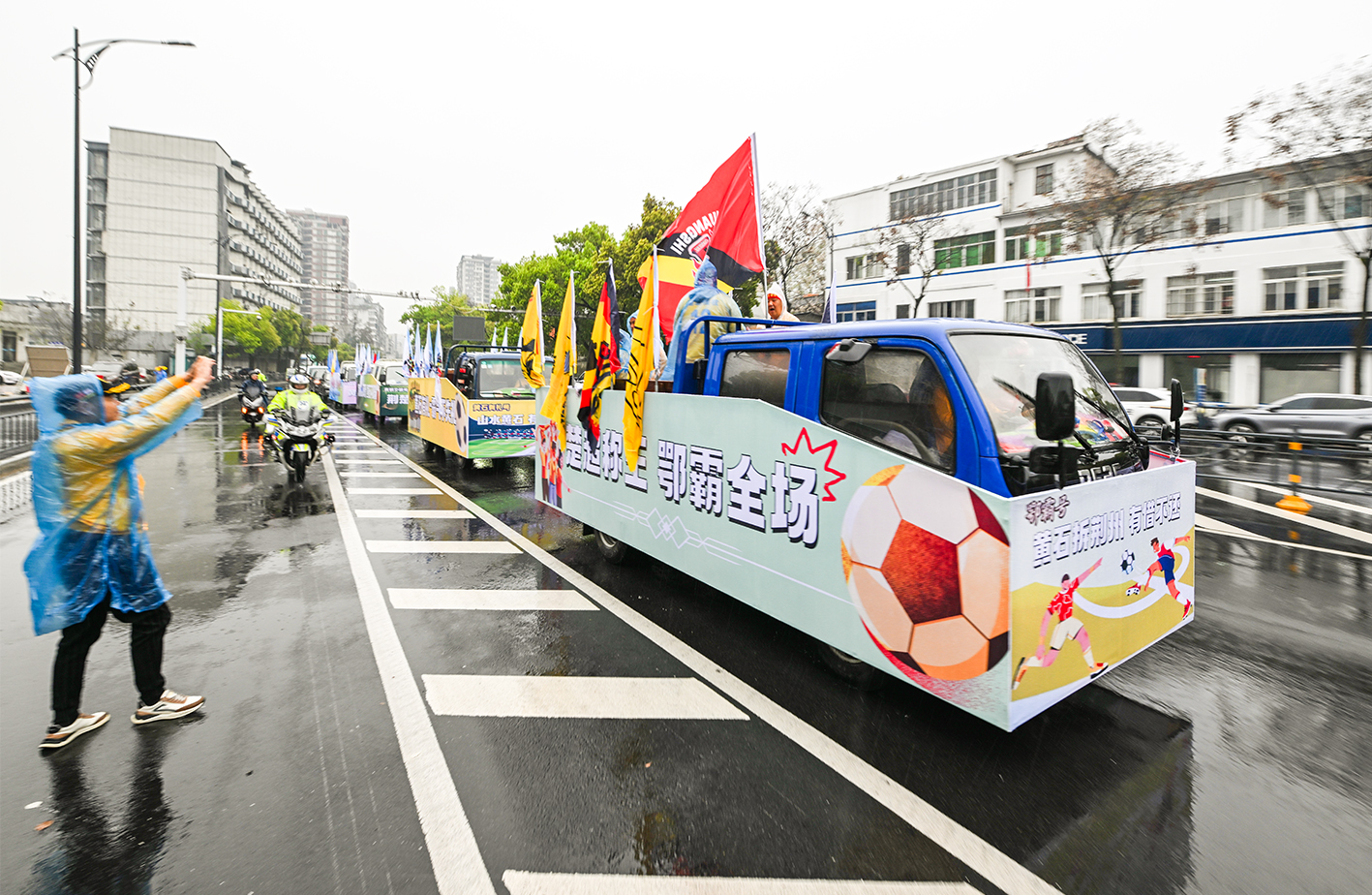 3月31日,黃石市球迷協(xié)會(huì)在城區(qū)啟動(dòng)花車巡游活動(dòng),近百名球迷風(fēng)雨無阻,用熱情和吶喊為“楚超”開幕吹響沖鋒號(hào)。黃石融媒記者 鄢巍 攝
