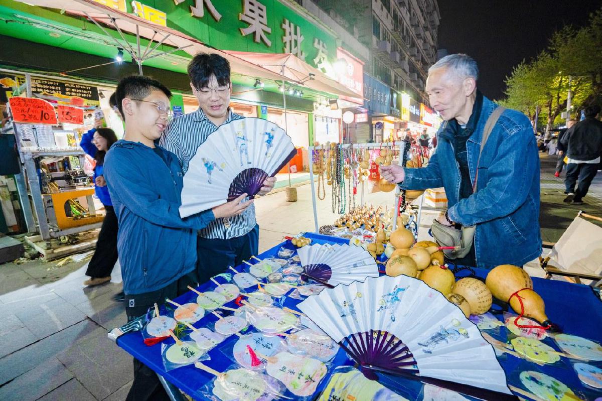 15日,武漢路夜市上,邵師傅繪制的帶有“楚超”元素的烙畫(huà)葫蘆與扇面畫(huà)頗受市民青睞。隨著“楚超”在黃石火熱開(kāi)幕,越來(lái)越多群眾參與其中,樂(lè)在其中。