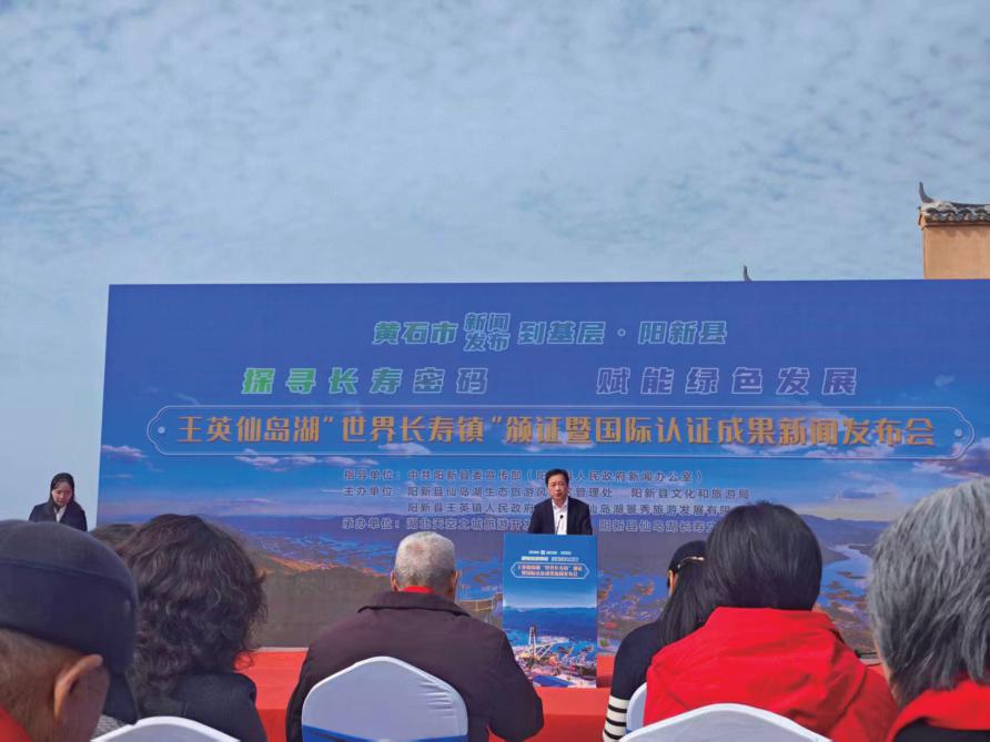 10月29日,正值重陽佳節(jié),秋高氣爽,陽新縣王英鎮(zhèn)天空之城景區(qū)人潮涌動。在眾多游客的矚目下,一場“探尋長壽密碼 賦能綠色發(fā)展——王英仙島湖‘世界長壽鎮(zhèn)’頒證暨國際認(rèn)證成果新聞發(fā)布會”舉行。