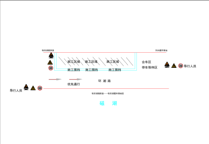 1、施工期間,使用圍擋封閉臨湖一側機動車道(封閉寬度4米)。保留一車道通行,來往車輛按照現(xiàn)場疏導人員指揮,交替通行。