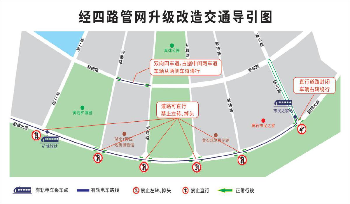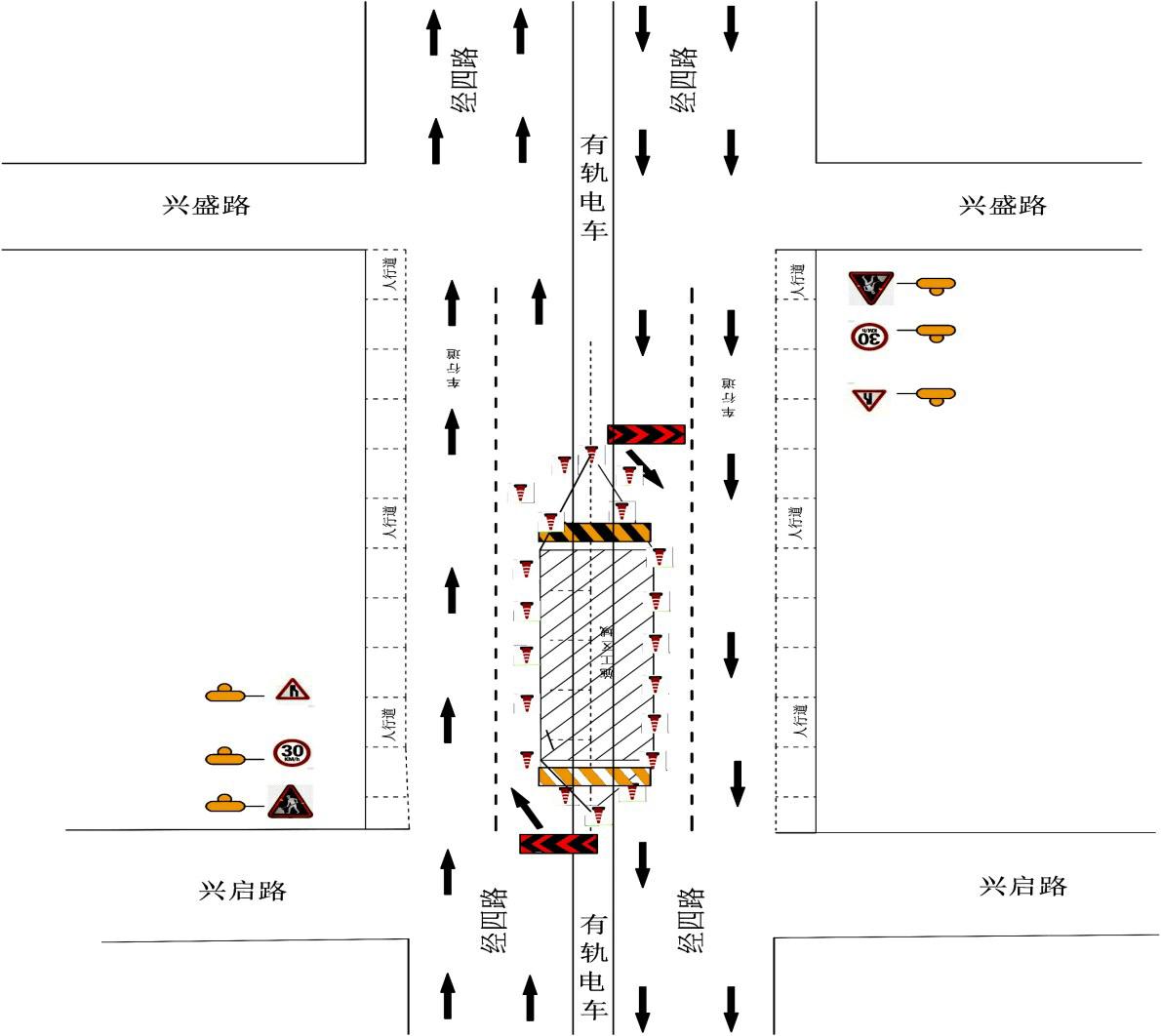 1.施工期間,使用圍擋封閉經四路(興盛路路口—興啟路路口段)東西雙向內側機動車道,保留雙向外側機動車道通行。