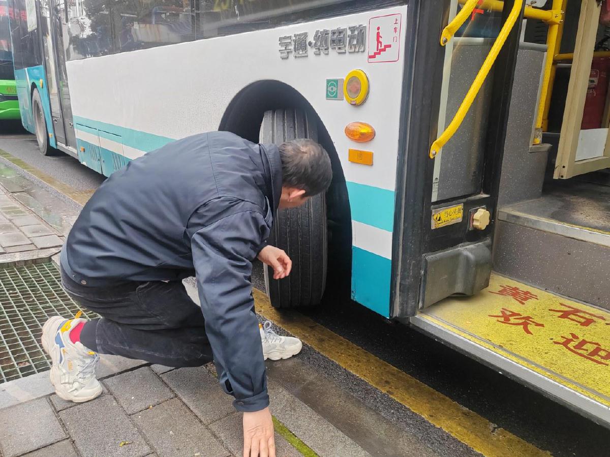 公交集團(tuán)工作人員在檢查公交車車胎