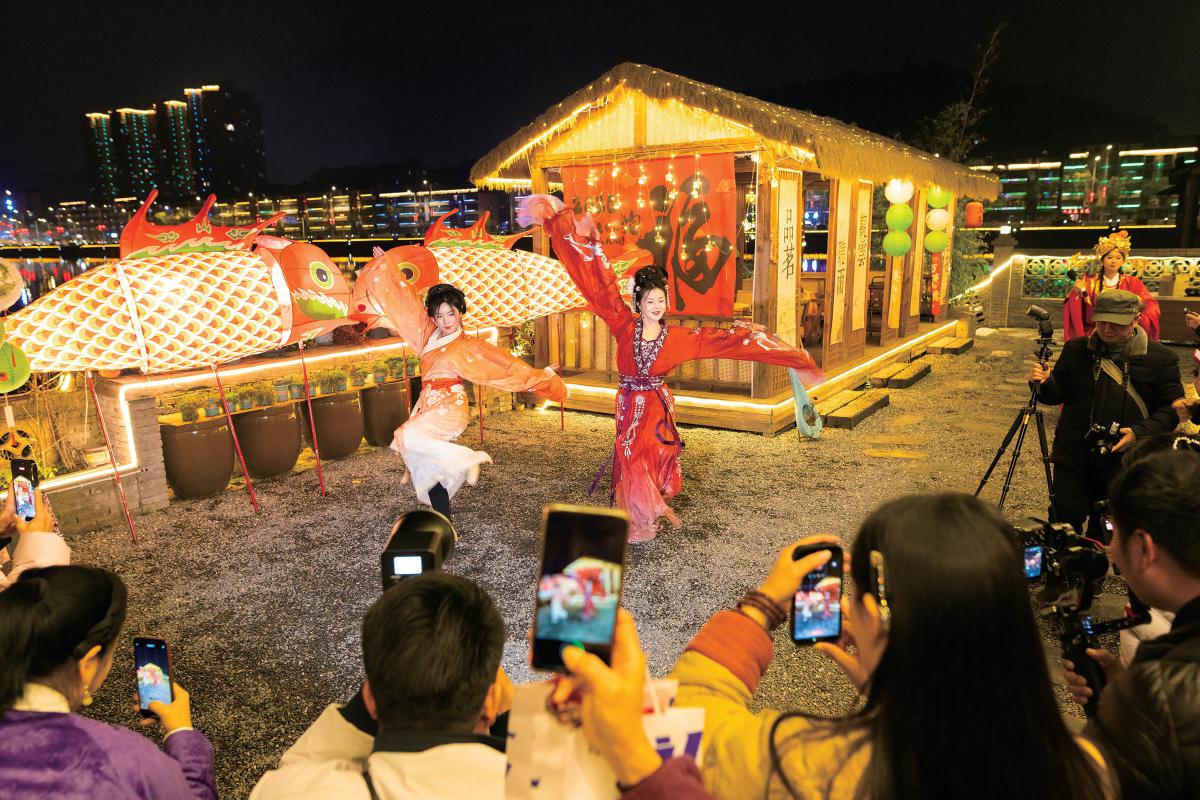 3日晚,在磁湖情人路國風(fēng)小院,魚燈倒映水面,漢服衣袂翩躚,湖畔流光溢彩,盡顯元宵佳節(jié)浪漫?!↑S石融媒記者 石勇 攝