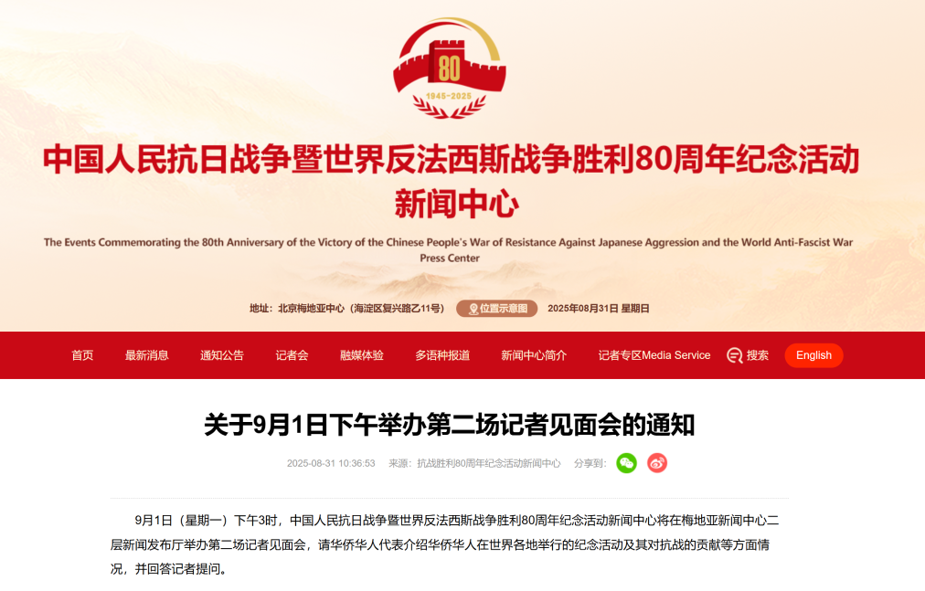 9月1日(星期一)下午3時(shí),中國人民抗日戰(zhàn)爭暨世界反法西斯戰(zhàn)爭勝利80周年紀(jì)念活動(dòng)新聞中心將在梅地亞新聞中心二層新聞發(fā)布廳舉辦第二場記者見面會(huì),請華僑華人代表介紹華僑華人在世界各地舉行的紀(jì)念活動(dòng)及其對抗戰(zhàn)的貢獻(xiàn)等方面情況,并回答記者提問。