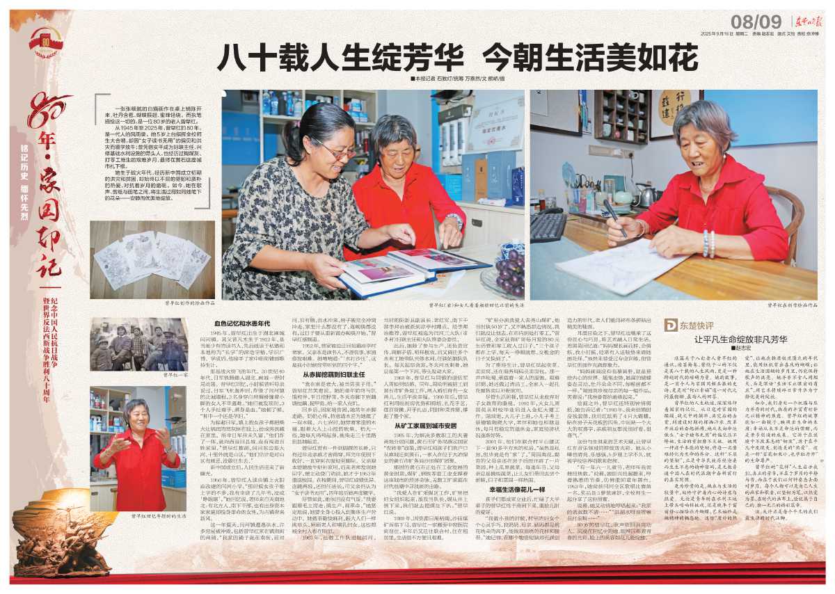 曾早紅的人生軌跡,深深烙印著國(guó)家的記憶。從日寇對(duì)家園的蹂躪、戰(zhàn)火中的顛沛、洪災(zāi)后的赤貧,到建設(shè)時(shí)期的揮灑汗水、改革開(kāi)放后的奮起拼搏,她從未向命運(yùn)低頭?!芭幼x書(shū)無(wú)用”的偏見(jiàn)壓不垮她,生活的重?fù)?dān)磨不滅她。她用一種近乎本能的堅(jiān)韌,將每一次磨難轉(zhuǎn)化為生命的養(yǎng)分。這種“不屈的堅(jiān)韌”,正是中華民族歷經(jīng)滄桑而生生不息的精神密碼,是無(wú)數(shù)普通中國(guó)人在時(shí)代浪潮中奮楫前行的真實(shí)寫(xiě)照。