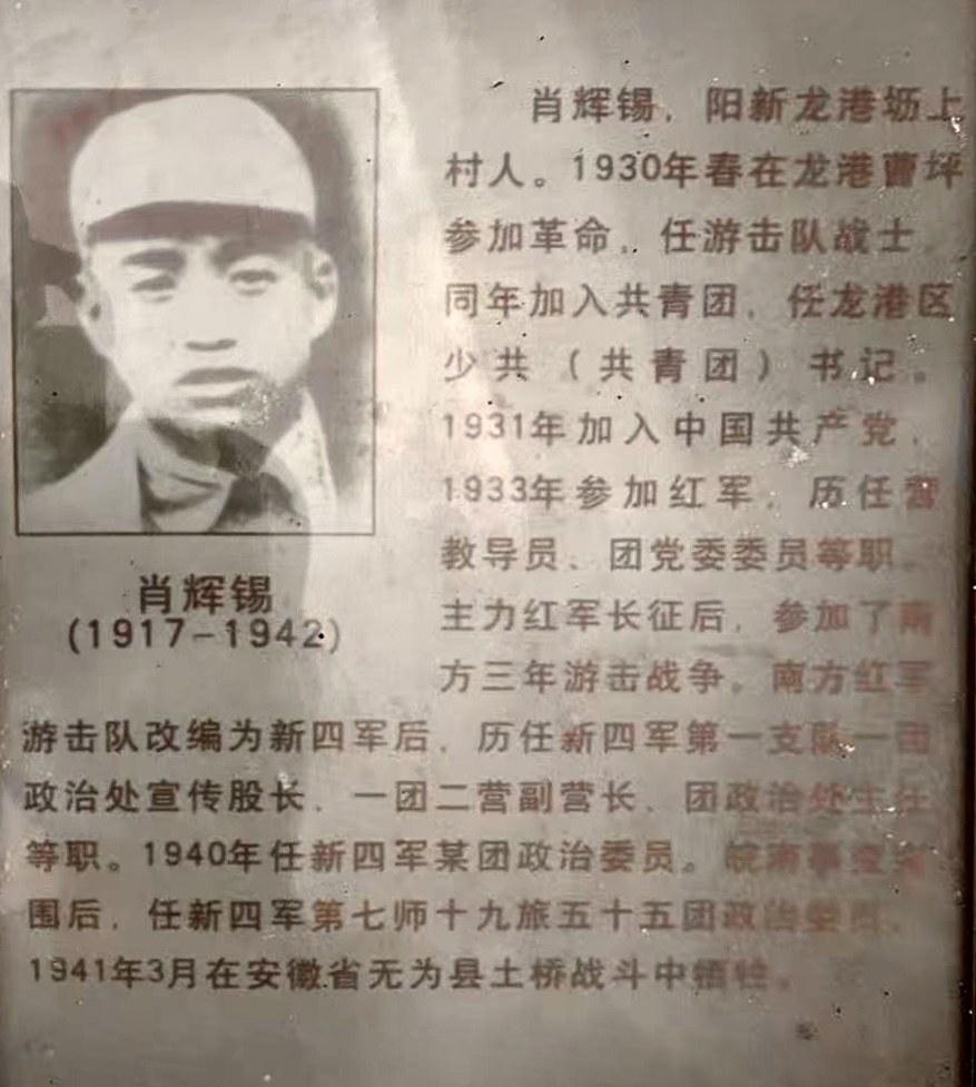 1928年,年僅11歲的肖輝錫加入村兒童團(tuán),隨后投身革命,在湘鄂贛邊區(qū)堅(jiān)持游擊戰(zhàn)爭(zhēng)。1942年5月,肖輝錫帶隊(duì)執(zhí)行任務(wù)時(shí)突遇日軍炮艇的機(jī)槍掃射,他與戰(zhàn)友們?cè)⊙獖^戰(zhàn),最終全部壯烈犧牲,年僅25歲。