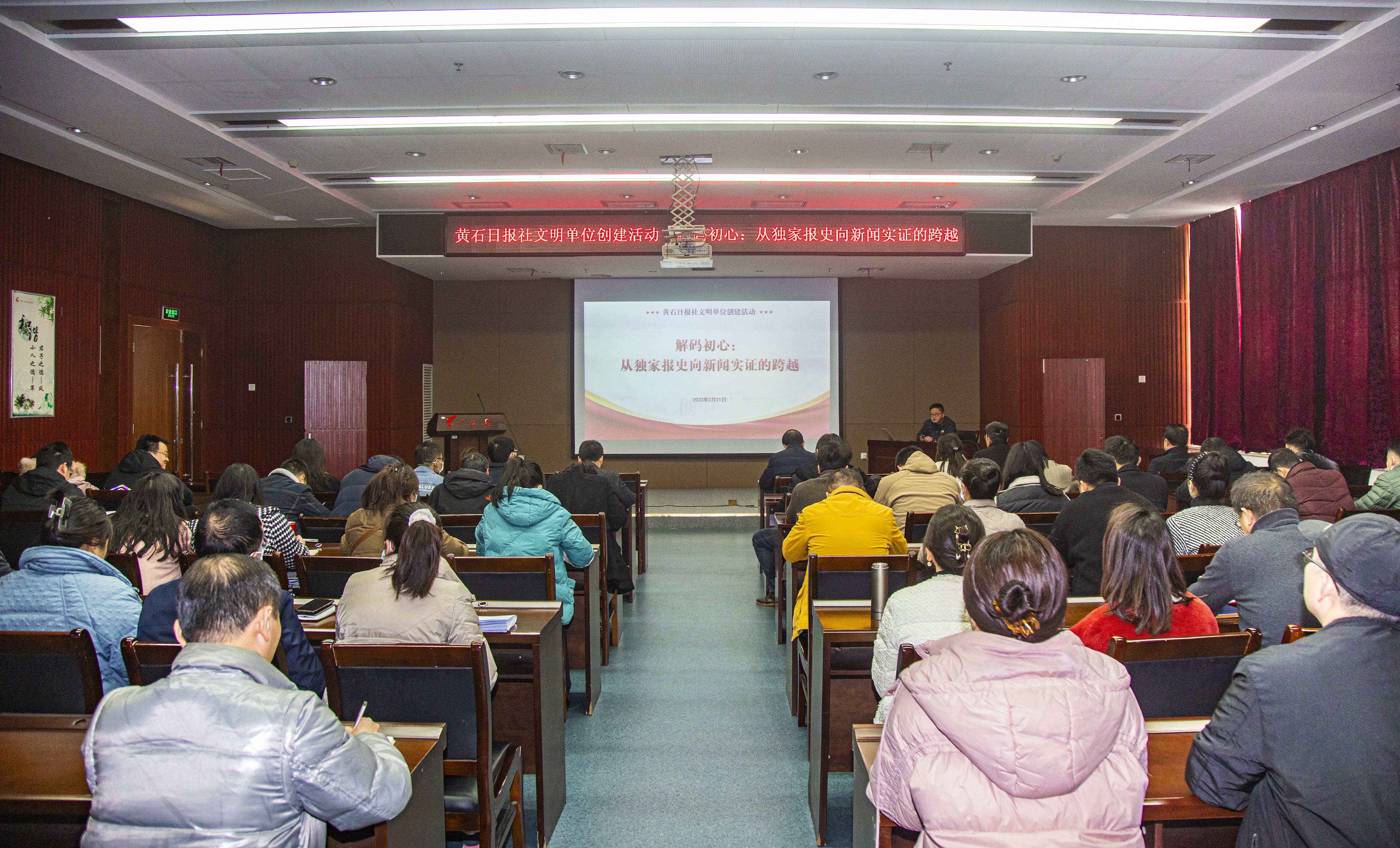 2月21日下午,黃石日報(bào)社文明單位創(chuàng)建活動——2023年“‘強(qiáng)四力’促深融”重大主題報(bào)道講座《解碼初心:從獨(dú)家報(bào)史向新聞實(shí)證的跨越》在黃石日報(bào)社3樓學(xué)術(shù)報(bào)告廳舉辦,報(bào)社近百名采編人員參加了學(xué)習(xí)。