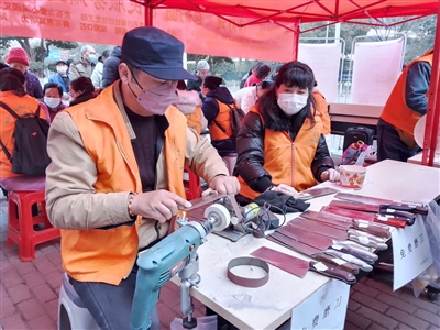 當(dāng)天上午8時(shí)許,黃石市愛心滿園義工協(xié)會(huì)的義工們早早來到現(xiàn)場,有的義工忙著布置現(xiàn)場,有的準(zhǔn)備包湯圓的原料。經(jīng)過一系列布置,免費(fèi)按摩、理發(fā)、磨刀、維修家電等20多項(xiàng)便民服務(wù)準(zhǔn)備就緒。