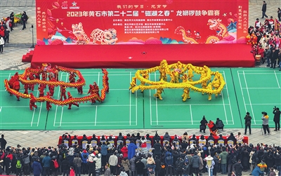 2月5日,在黃石園博園主場館前,2023年黃石市第二十二屆“磁湖之春”暨“全民健身迎新春”元宵節(jié)龍獅鑼鼓爭霸賽精彩上演。記者?周巍?攝