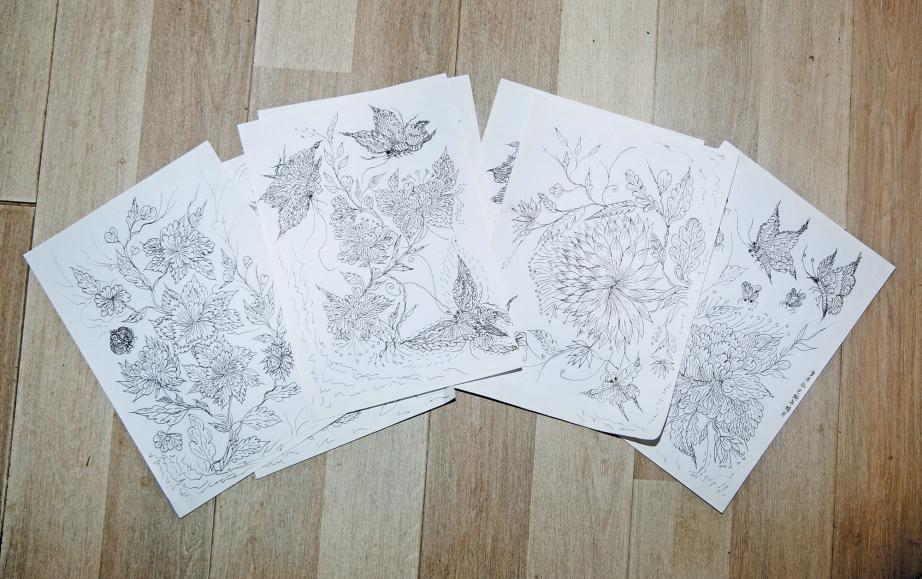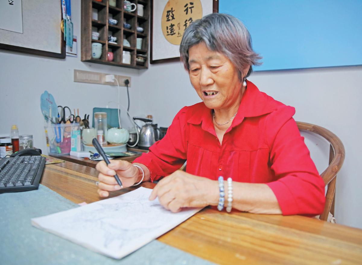 一張張細膩的白描畫作在桌上鋪陳開來,牡丹含苞、蝴蝶振翅、蜜蜂輕繞。而執(zhí)筆描繪這一切的,是一位80歲的老人曾早紅。