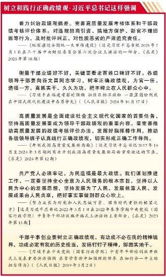 黨的二十屆四中全會審議通過的“十五五”規(guī)劃建議明確提出“樹立和踐行正確政績觀”。新征程上,廣大黨員干部要牢固樹立和踐行正確政績觀,把對黨忠誠、為黨分憂、為黨盡職、為民造福作為根本政治擔當,保持平和心態(tài),看淡個人進退得失,心無旁騖努力工作,為黨和人民做事,創(chuàng)造無愧于黨、無愧于人民、無愧于時代的業(yè)績。