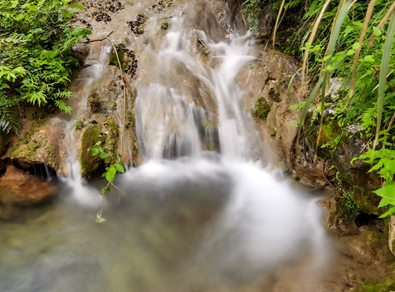 沿著碎石子鋪成的蜿蜒山路向上行走,忽聽得淙淙的流水聲,溯溪而上,流水聲由遠(yuǎn)及近,循聲而覓,一道瀑布映入眼簾。奔騰的清泉從山間噴發(fā)而出,順流而下,直奔??诤?。清風(fēng)解意,吹來滿臉的霧珠,驅(qū)散了行走的炎熱,帶來涼爽和愜意。