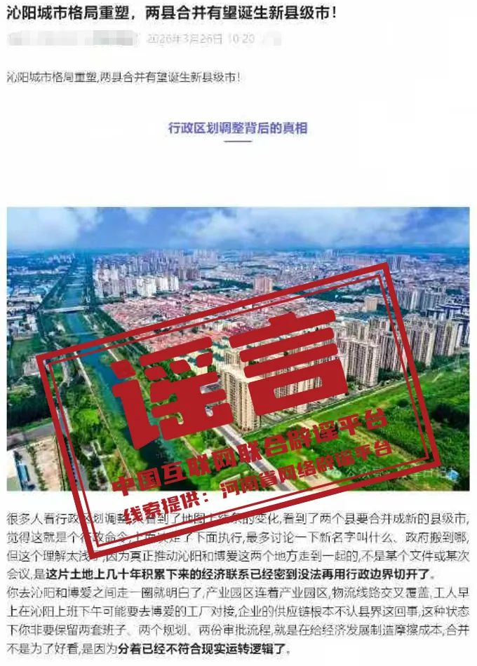 ????詳情:近日,某平臺(tái)賬號(hào)發(fā)布標(biāo)題為“沁陽(yáng)城市格局重塑,兩縣合并有望誕生新縣級(jí)市”的文章,稱(chēng)“焦作市的沁陽(yáng)和博愛(ài)要合并成新的縣級(jí)市”,引發(fā)關(guān)注。經(jīng)核實(shí),相關(guān)網(wǎng)傳消息毫無(wú)事實(shí)依據(jù),系賬號(hào)主辦者為博取關(guān)注、吸引流量而編造的虛假信息。河南省焦作市網(wǎng)信辦已責(zé)令賬號(hào)主辦者刪除相關(guān)信息,并對(duì)其進(jìn)行了批評(píng)教育。(來(lái)源:“清朗河南”微信公眾號(hào)、焦作市互聯(lián)網(wǎng)舉報(bào)和辟謠平臺(tái))