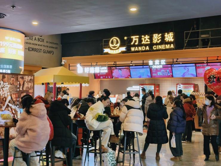大年初一傍晚,團城山萬達影城人潮涌動。影院大廳內(nèi),購票機前、取票機前都排起了長隊。