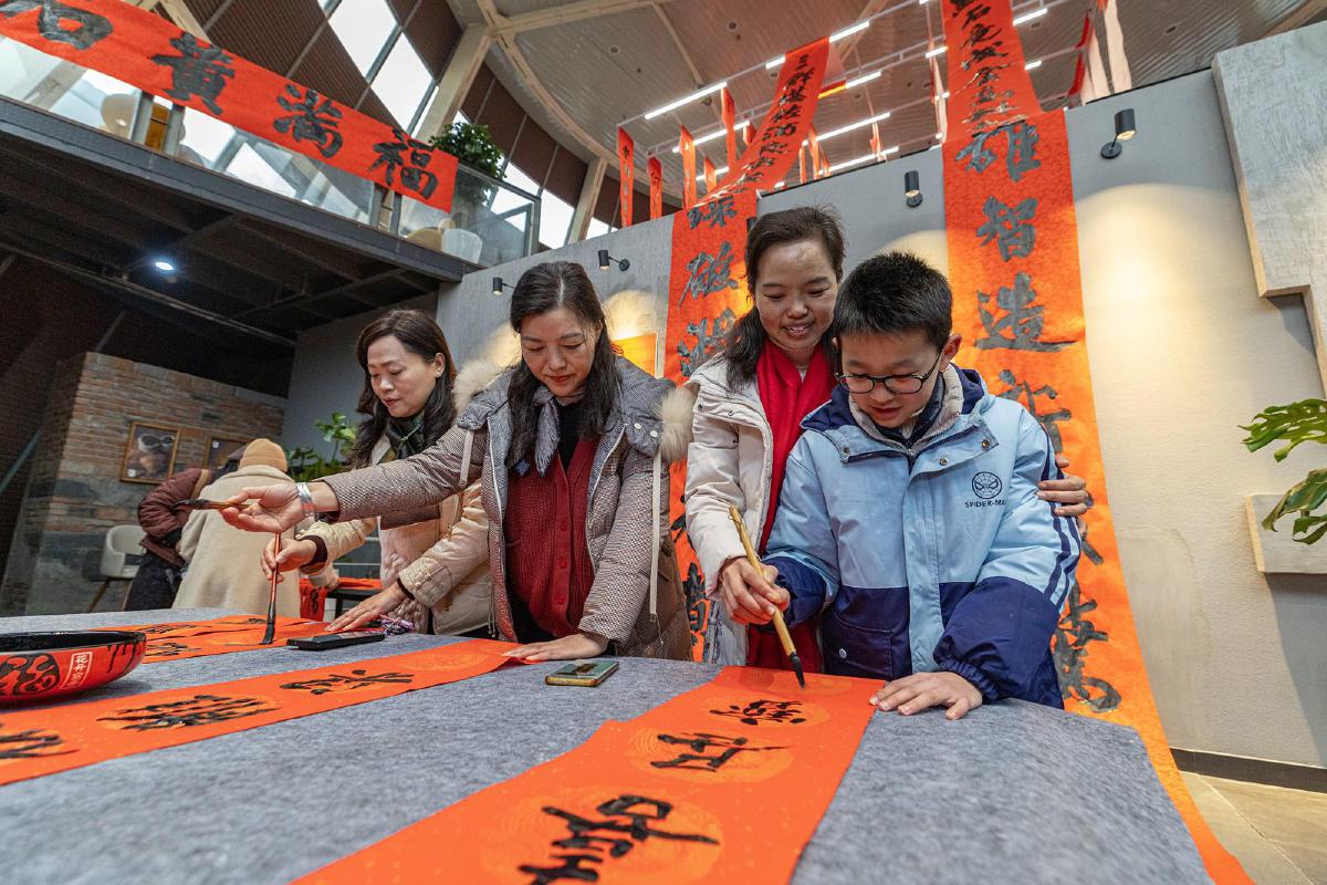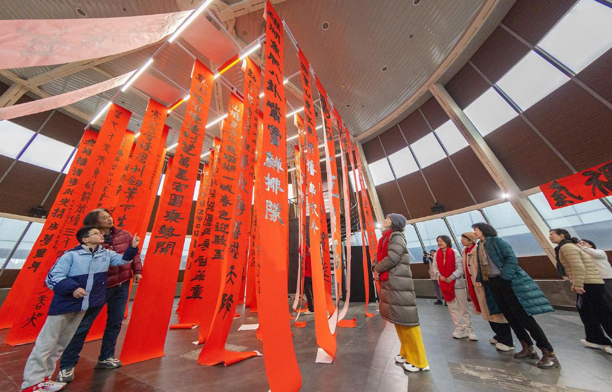 10日,黃石市首屆巨幅春聯(lián)展在市融媒體中心開(kāi)展,市民在巨幅春聯(lián)前打卡拍照。據(jù)了解,本次展覽由市融媒體中心何戈攝影工作室聯(lián)合湖北理工學(xué)院吳永斌書(shū)法工作室共同舉辦,邀請(qǐng)書(shū)法愛(ài)好者書(shū)寫(xiě)6-13.8米長(zhǎng)的巨幅春聯(lián),融書(shū)法之美與光影之妙,傳遞新春祝福。?。S石融媒記者 周巍 攝)