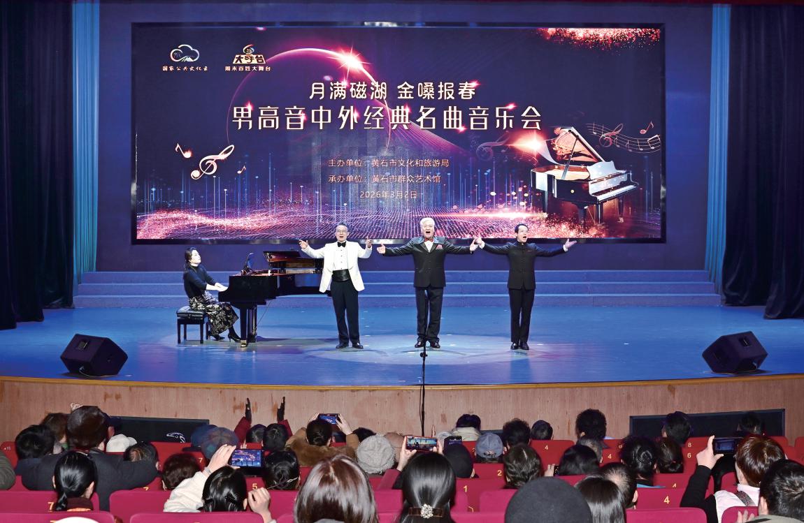 3日,“月滿磁湖 金嗓報(bào)春”男高音中外經(jīng)典名曲音樂會(huì)在市群藝館舉行,特邀著名男高音歌唱家樂漢寧、鐘家明、劉盛昌聯(lián)袂主唱。(黃石融媒記者 石勇攝)