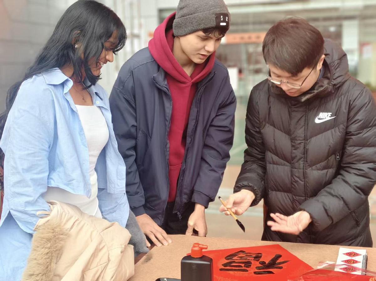 經(jīng)過一番創(chuàng)作,三人合作的春聯(lián)終于完成。大紅紙上,墨香氤氳,字跡雖略顯稚嫩,卻一筆一畫都飽含著異國友人對中國新年的真摯祝福。