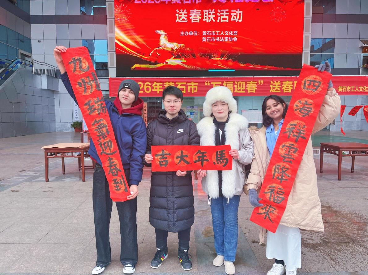 人群中,返鄉(xiāng)過年的華僑朱軼繼續(xù)帶著她的兩位外國朋友——湖師大留學生吳迪和方月,一邊講解春聯(lián)里的中國寓意,一邊在市書法家協(xié)會楷書委員會秘書長瞿筱俊的指導下動手寫春聯(lián)。當天下起了小雪,雪花漫天飄舞,墨香暖在心頭。黃石的年味,就這樣在他們筆下跨越國界,為馬年新春寫下一個溫暖的注腳。