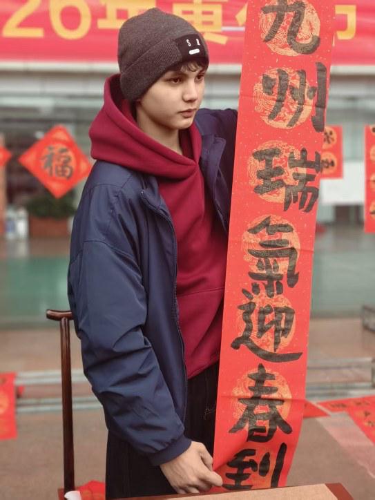 看到兩人進步明顯,朱軼提議:“我們合作寫一副春聯(lián)吧!”三人當即分工:吳迪書寫上聯(lián)“九州瑞氣迎春到”,方月書寫下聯(lián)“四海祥云降福來”,朱軼負責橫批“馬年大吉”。