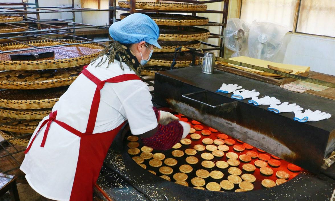 第一批樣品出爐冷卻,挨個做上記號,再放置一段時間觀察,持續(xù)多批次留樣記錄對比,益朵港餅才有了現(xiàn)在的厚度?!皼]有改進的打餅機和包餡機,做不出這么薄的港餅。薄才能熟透、有酥脆感,沒想到做出來大家都很喜歡。”經(jīng)過程宏兵一系列創(chuàng)新改良,益朵港餅縮減的厚度約相當于2個半1元硬幣的厚度。
