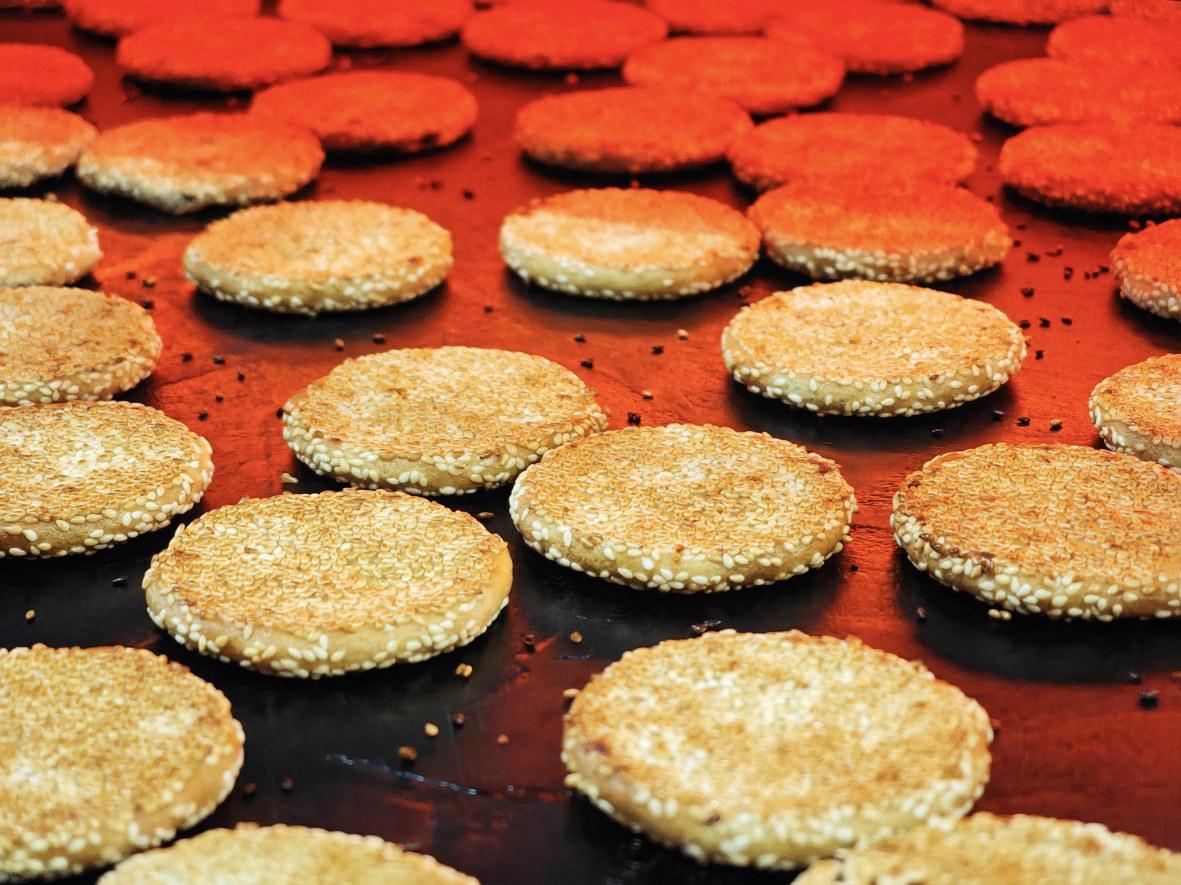“我們的港餅生坯厚度大概5-6毫米,直徑不超過6.5厘米。經(jīng)過烘烤出爐的港餅,厚度和傳統(tǒng)的相比大概縮減了三分之一?!辟即蟮聂せ鏁r針來回搖晃,里面的近百個港餅生坯在晃動間,均勻地裹滿白芝麻,益朵港餅創(chuàng)始人程宏兵俯身湊上前查看生坯厚度。