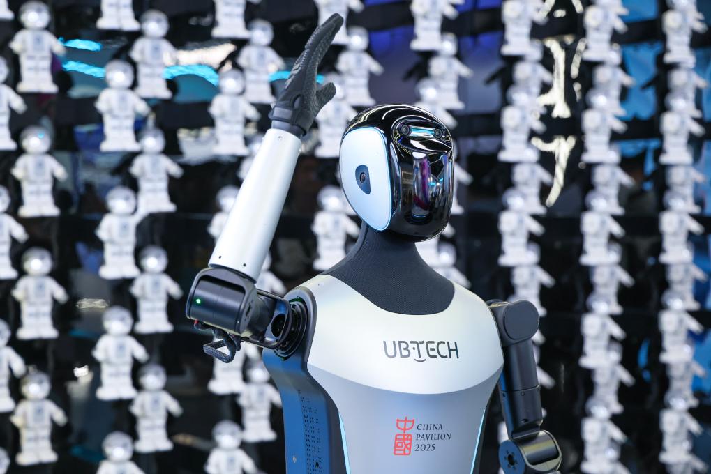 △ 2025年4月23日,在深圳優(yōu)必選科技展廳內(nèi),商用版人形機器人Walker C向觀眾揮手致意。