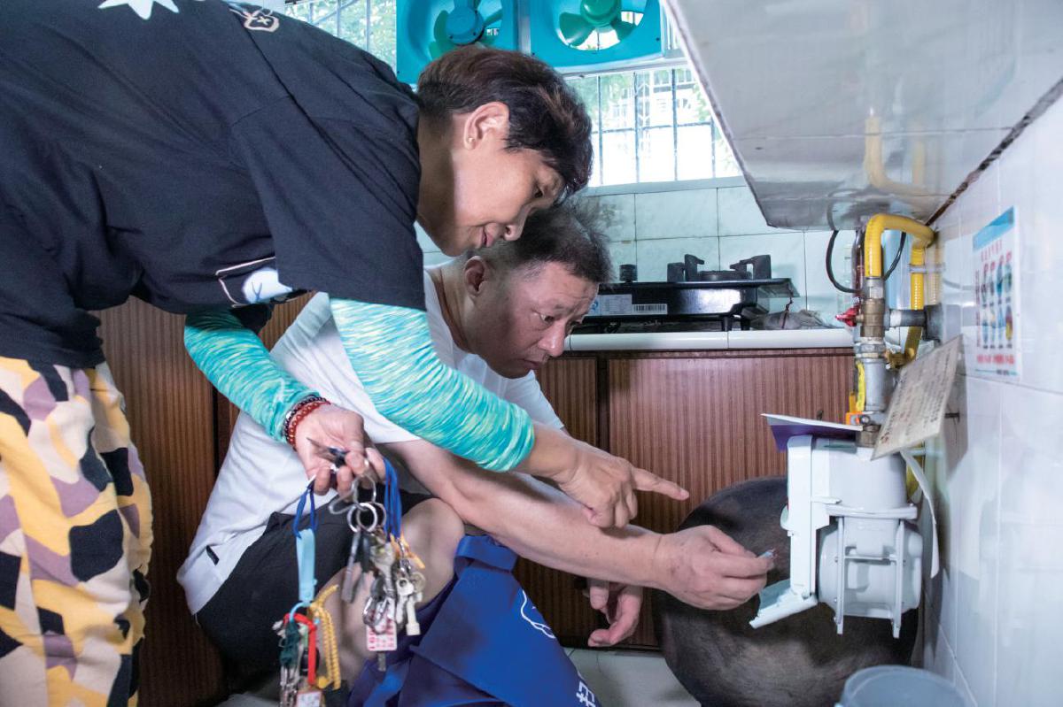 “唐媽媽家的燃?xì)獗碛行┕收?,你和我一起去看看??月30日上午,在開發(fā)區(qū)·鐵山區(qū)建設(shè)路社區(qū)礦一路22棟樓下,于文英撥通了居民李文東的電話。話音剛落,李文東匆匆下樓,與于文英會(huì)合,直奔老人唐雪霞家。